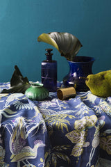 The exotic Paradise print paints an imaginary picture of the lush rainforest canopies of Far North Queensland. Whimsical birdlife sit within a colourful oasis of sweeping green palms and wild creatures. Every glance reveals the charms of the native forest and its surreal and sometimes odd avian inhabitants.